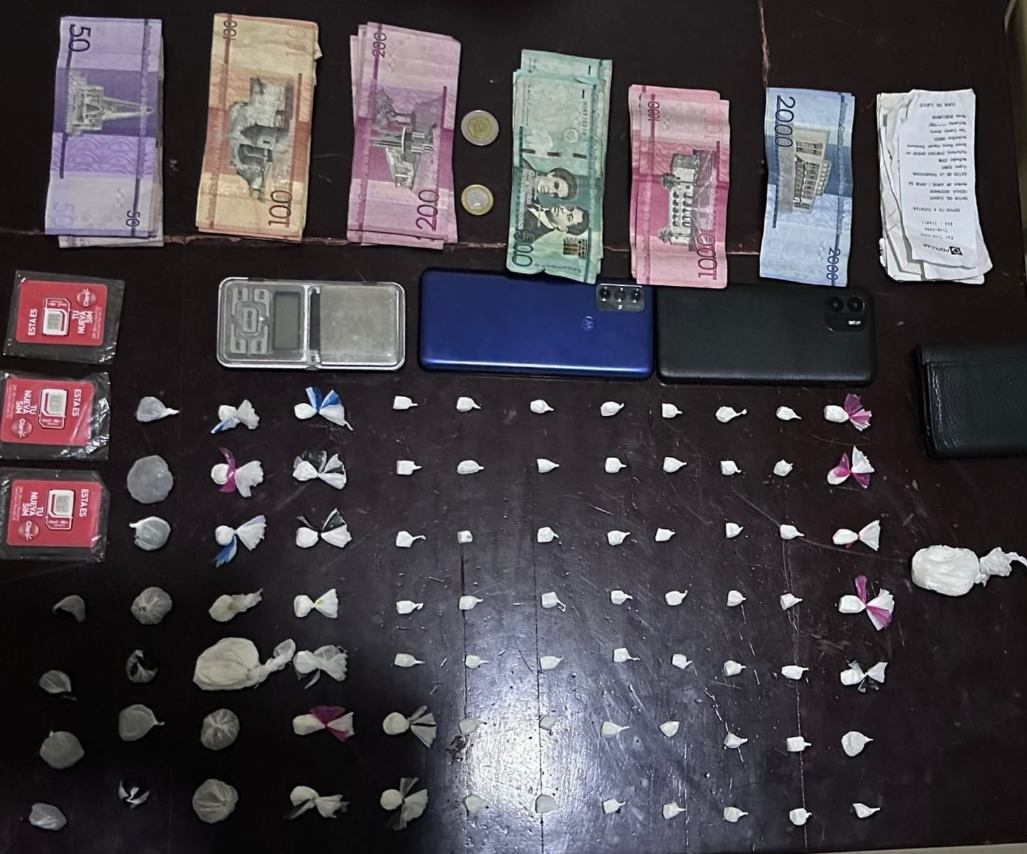 Además, se ocupó una balanza de color gris, dos celulares, 10 vouchers de depósitos bancarios, tres tarjetas SIM, una billetera para hombre, y RD$13,515 en efectivo.