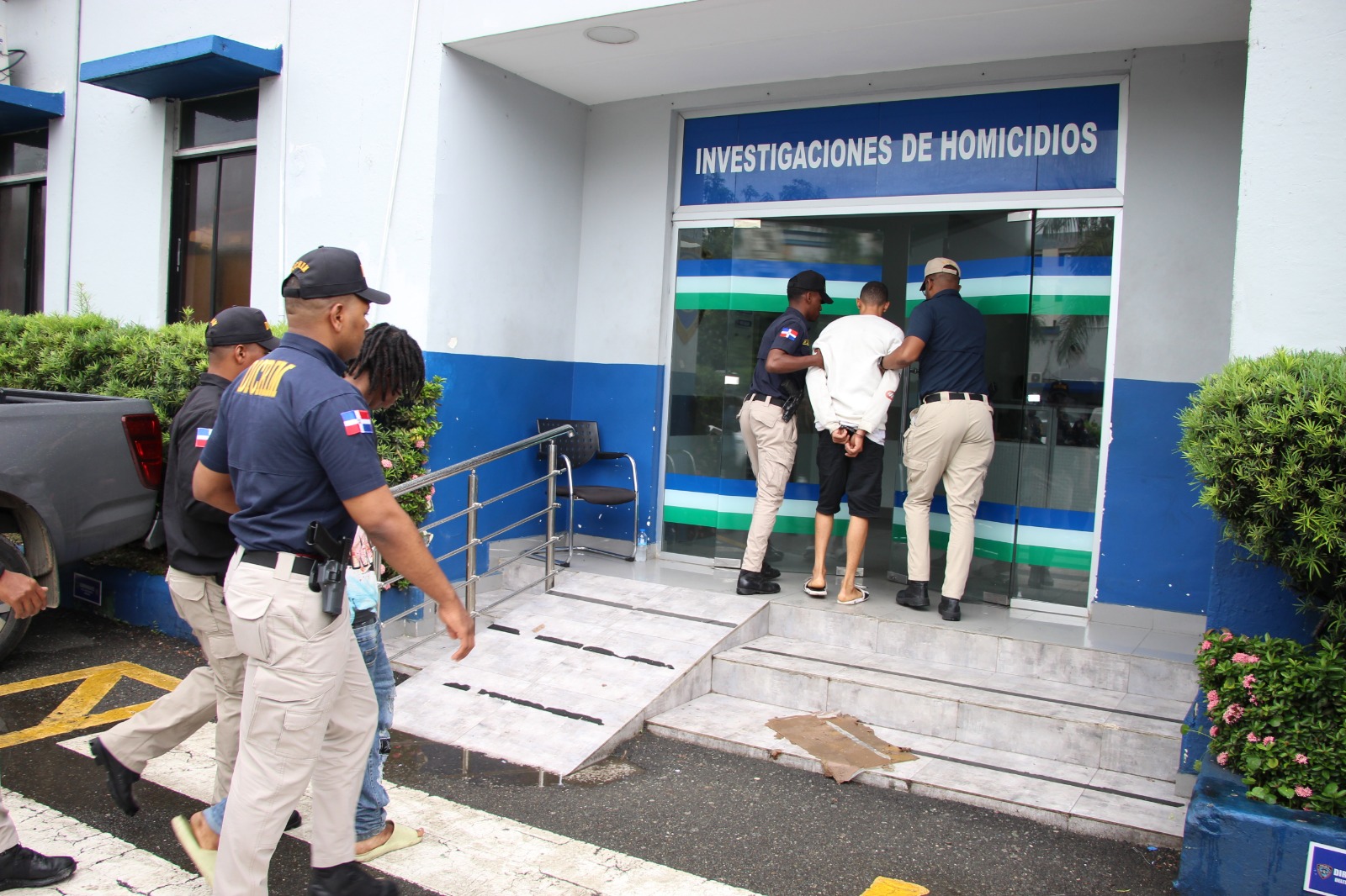 Agentes policiales, adscritos a la Dirección Central de Investigación (Dicrim), trasladan a la sede de la Policía Nacional, a dos presuntos delincuentes señalados como los autores de la muerte del capitán del Ejército de República Dominicana (ERD), Carlos Guillén Salas, en un hecho criminal cometido la madrugada del pasado 14 de julio en el sector Villa María, Distrito Nacional.